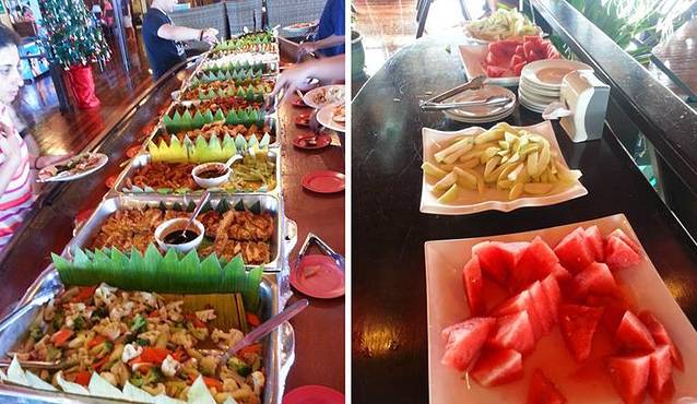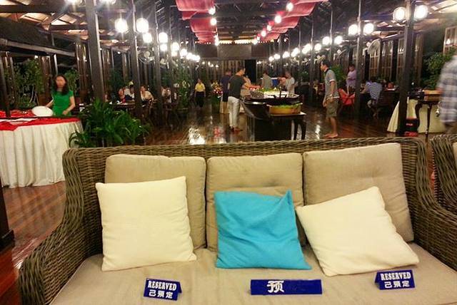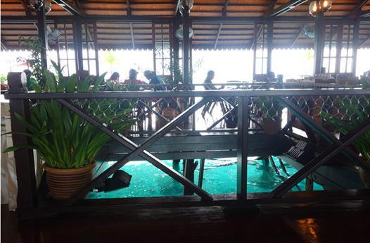 我们到达的时已快过午餐时间,工作人员就让我们先就餐再集合讲解。卡帕莱的早午晚三餐都是自助餐(度假套餐已包含餐费)的形式,菜式每餐都不一样。只要不造成严重浪费,你吃多少没人管你,但需遵守一定的规则。 餐厅设在一层甲板上,正中央设有观景区,让客人俯览甲板下游过的海洋生物。餐厅的前半部分是由几张沙发组成的休闲区,你可以窝在这里上网(可以搜到办公室的wifi)、看书。每晚的18:30或20:00,会放映当天DSD(体验深潜)的真人视频,楼主的视频也在这里播放过哦~ 餐厅四面都是开放式的,你可选择在室外望着无敌海景用餐,这里也是享受日光浴、阅读、小憩的好地方。