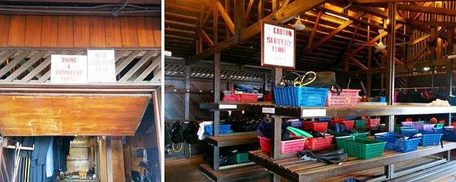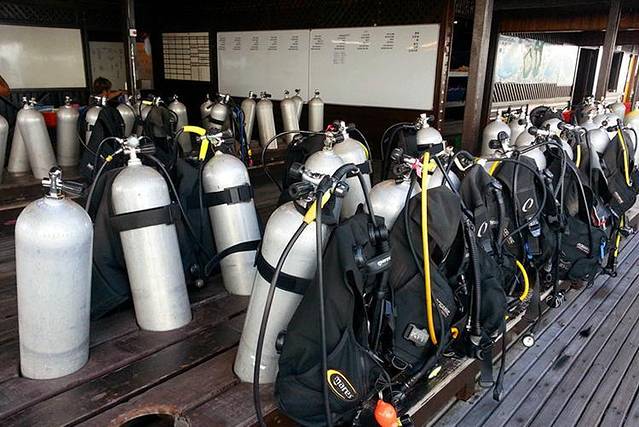 潜水中心是卡帕莱水上活动的核心地带。在这里,你可以免费借用救生圈、救生衣(每天19:00前还),也可有偿租用一切浮潜用具:呼吸管、面镜、脚蹼、潜水鞋、防晒衣等。租用价格按每天计算,在卡帕莱的所有消费到退房时统一清算,可用马币或信用卡。注意:预订4天3晚以上的深潜套餐并拥有15次深潜记录的游客可申请诗巴丹深潜名额。预订深潜套餐的游客,除抵达与离开的当天,都会安排3次船潜。水中心平台,游泳、潜水后可在此稍作休息,这里配有洗手间、淡水洗澡间、潜水服晾晒架和躺椅。潜水中心的服务台免费提供果汁、水、咖啡等饮料,还有一些简单的点心,休息的时候可以解馋。 你也可以把衣服、房间的钥匙寄存在这里。