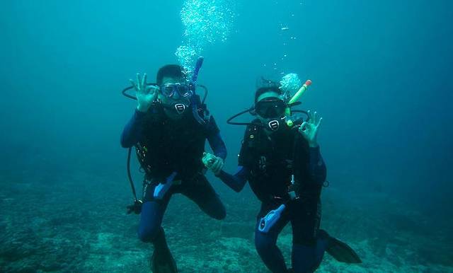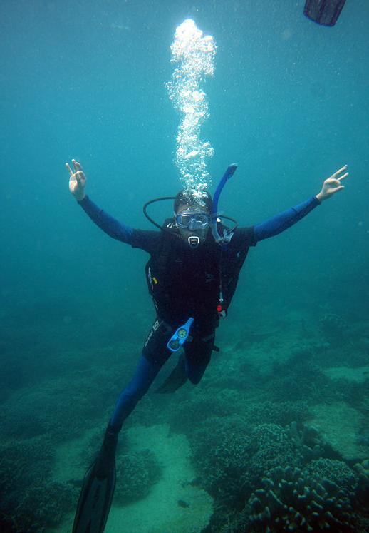 对于不同的人来说,有不同的学习难点,、而且刚开始时中性浮力总是掌握不好。对于不会游泳的我来说,最困难的就是水下摘面镜!!!天啊,我平时最怕把鼻子暴露在水里!!!做其他动作,只有面镜堵住鼻子,我一点也不慌,什么动作都可以做好。但是只要我的鼻子一暴露在水里,我就会下意识地用鼻子吸气,岂不是会被呛shi掉? 第一次果然不成功,其实还没有呛水,就是心理慌乱,觉得吐出的气泡把水打进我的鼻子去了,脚一蹬奔出水面。第二次我用极快的速度配合了一点点的憋气(其实憋气是不对的!),居然通过了,、!晚上我们顺利地拿到了PADI证书。好开心,大家纷纷合影留念。