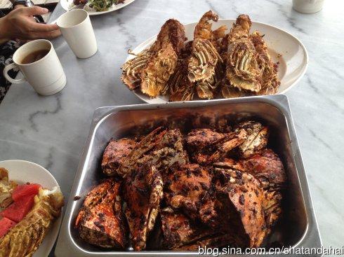 终于有心情买点海鲜犒劳自己。这里一共160元人民币,加40元加工费。我们邀请王峰夫妇一起享用,还留了一盘给教练,教练说他不太吃虾和螃蟹,端给其他DM和工作人员了。