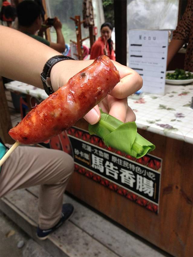 非常讨厌走路,坚持走下去的唯一动力就是栈道尽头五间屋卖的烤香肠!!马告香肠非常特别,里面加了有木姜子,有一点柠檬香茅的味道,吃法是吃一口香肠再配一口当地的三苏~来一口真心满足~一定要去吃!