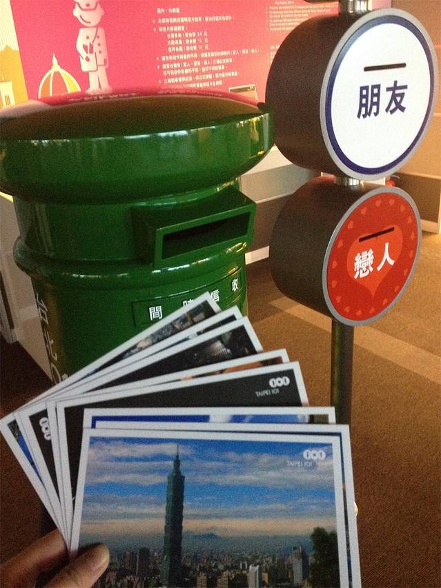 中午12点过,我们终于又回到了台北!酒店下午3点才能入住,索性寄存了行李就出门去溜达了~因为只有一个下午的时间,我们就选择了比较近的地标性建筑——台北101,作为第一站。台北101的电梯竟然是世界上最快速的电梯!!体验了一下……真心快,感觉几十秒就到顶了~101上可以俯瞰大半个台北,望出去的风景可以通过讲解器的解说进行了解~走一圈下来还是要近1个小时的时间~101上面有几个卖纪念品的地方,还有邮筒可以寄明信片。老规矩,给几位小伙伴寄出了第二张明信片~