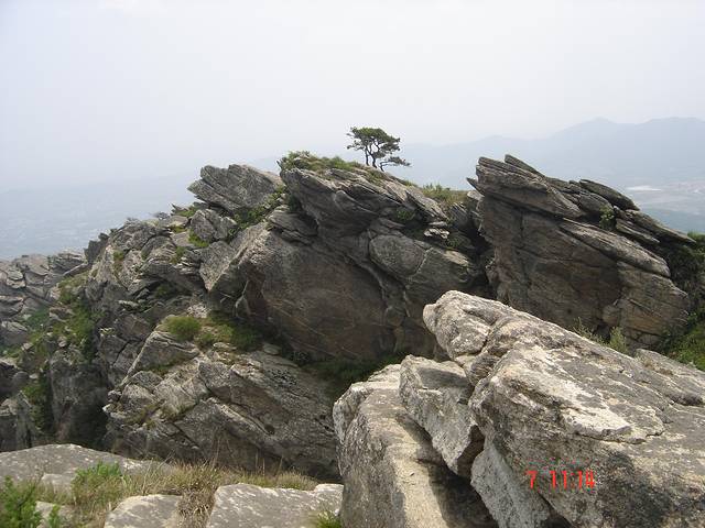 及至半山腰,视野开阔了许多,北衍黄海之灵秀,雄距古牟国故城之西,东与海上灵芝般的芝罘岛相望,南瞰胶东屋脊牙山之雄。山峰险峻挺拔,脚下的石头却无嶙峋之感,大多无角无棱,山上有一些像灵芝的巨石悬在半空之中,特别适合观景,立于其上,山风习习,有些眩晕。磁山之变是沧海桑田真实的写照,磁山之变是多么神奇!肉身会衰老、死亡、腐朽和风化,而山对于人的寿命要永恒的多,不免暗淡,在大自然面前,人类是多么的渺小,人的生命真的很短暂,匆匆又匆匆,今天我在这里看山,几十年后,我早已随风逝去,立于这块石头上的看山的人又会是谁呢?