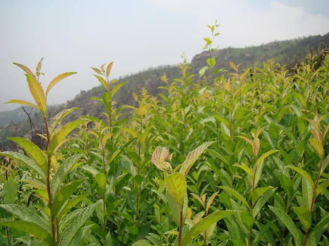 在往山下走,看到的是红色石刻“金牛谷”三个大字,顾名思义,是因磁山有金牛的传说而得名。金牛谷东边有一片茶园,据上山的老伯介绍,这片茶园叫磁山茶,春天采其嫩叶,阴干后以水泡饮,其味清香扑鼻,风味独特。