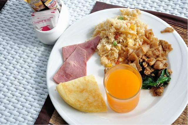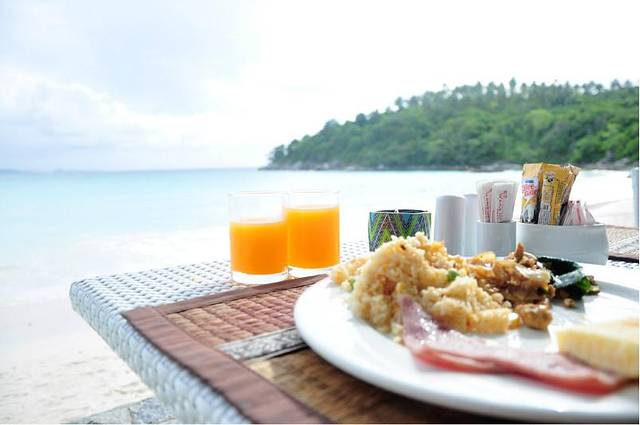 室外有些热。兴许是室内空调开得太足的缘故。酒店还是有含早餐的,就在昨晚吃饭的海边餐厅。需要脱鞋到室内拿食物,也是中式西式泰式的。很丰富。这时候发生了一件恐怖的事,我拿了吃的出来,把盘子放在桌子上拍照,因为坐在海滩室外,结果就有一只小鸟过来想偷吃我盘子里的炒饭。我是天生巨怕鸟的人,于是大喝一声让它飞走。这时候突然感觉肩上什么东西也扑腾了翅膀一下。我立刻大叫起来。差点把相机扔掉了。后来案件分析,可能是这两只协同作案,一只站在肩头分散注意力一只偷吃。吓死我了。现在写这段我都毛骨悚然。。后来还是换到室内坐。实在受不了再来只鸟什么的,我只有跳到海里了。