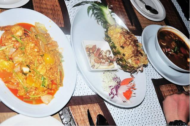 虽然朋友们都警告我不要公布价格,以免天朝人民趋之若鹜之后的结果就是泰国人民学精明后惨无人道地涨价。今后就再也吃不到性价比如此高的生猛海鲜。但是我还是要说一句,你能想象这一大堆暴发户式的盘盘碗碗,比我手臂粗的龙虾,大虾,鱿鱼,巨大两份菠萝饭,冬阴功汤,咖哩蟹,四个人连买带加工就是300多人民币吗?有没有想对泰国物价飙泪的冲动?