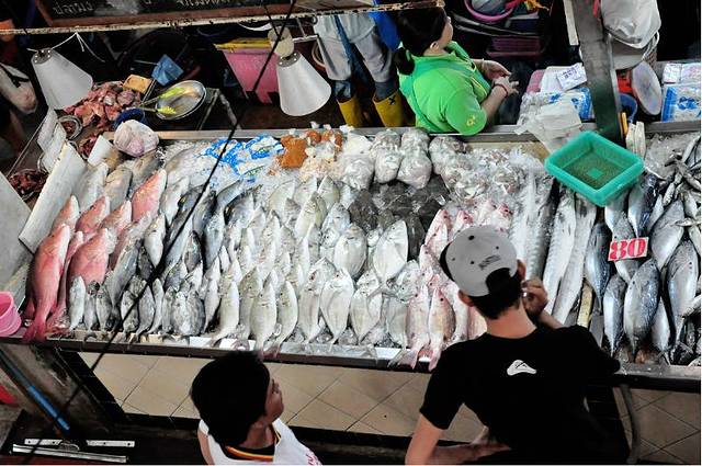 早起的人们三三两两在街上,我们走出酒店往江西冷方向逛过去。可能因为下过雨,所以并没有感觉很热。空气还是很清爽的。结果地标建筑江西冷商场就在昨晚我们走的相反方向。大概十来分钟的路程。 周末的原因。又太早。江西冷所有商店都关着门,幸运的是我们走的这条路直通江西冷后门。正对着著名的bazzan food village。巴图海鲜市场,看到它的那一瞬间。我们立马决定把后面吃海鲜的行程提前以抚慰我们受伤的心。海鲜市场。跟海南三亚的第一市场差不多的感觉。有各种农产品蔬菜海鲜瓜果调味品售卖。就是国内的农贸市场。这里很著名的原因是二楼的your kitchen。可以帮你加工海鲜的一个小吃店。