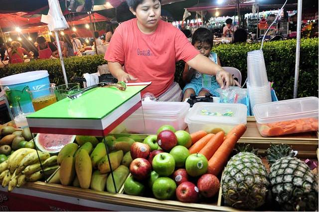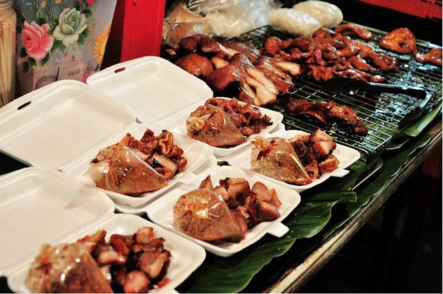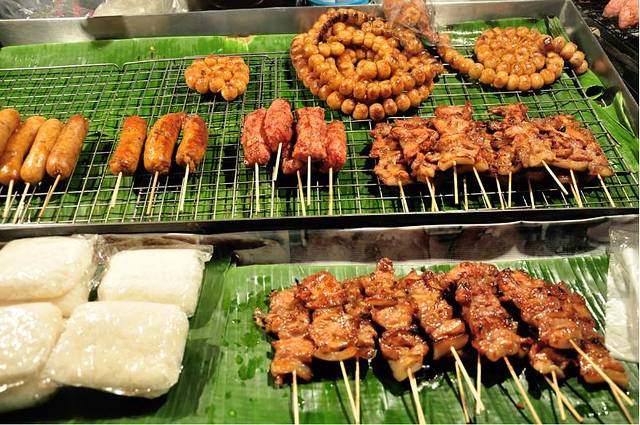 想洗澡睡觉,结果为了退第二天的pp岛和核对晚上西蒙人妖秀时间又浪费掉我不少时间,只迷迷糊糊眯了一会儿,那股晕车的劲好一会儿才缓过来。所以一直到华灯初上才出去觅食,突然很馋海鲜市场的冬阴功汤,结果网上说那里5点半就关门了。还是想碰碰运气。什么都没买到。your kitchen也关门了。只有将就点了旁边那家的菠萝饭。门口中文的帘子写着如何如何好吃。结果拿上来我们超级失望。跟your kitchen完全没有办法比。 可能来的太晚。所以东西都买不到了。大家都有点没有吃饱的感觉。结果运气很好。下楼就遇见夜市。好多好吃的。一群人瞬间满血复活。。
