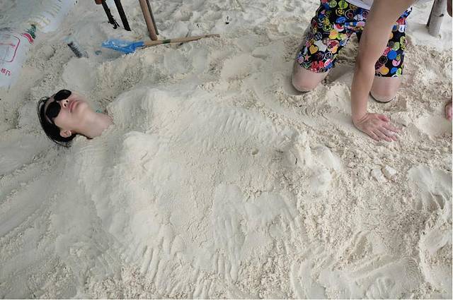 到racha海滩的时候基本上没有什么人了。一日游的都回去了,在racha海滩玩了一会儿。发现突然黑云压顶。远远地飘了过来。 于是只剩下我们和租躺椅的老板一家人。老板的小儿子开始帮忙收伞。我们不愿意离开,想等着雨云飘过去看等下会不会天晴。结果巨大的风吹来,我们还是只能躲进老板的工棚,跟老板娘攀谈。她说这里经常这样。下十分钟雨就晴天了。她要下班了,我们可以继续玩。 躲雨的时候,闲着无聊。就把朋友的老婆埋在了沙里。还煞有介事做了沙雕。老板的小儿子觉得我们很好玩。也在一旁傻傻地看,不时大笑。无聊人做无聊事。当然也自有那种莫名其妙的快乐。