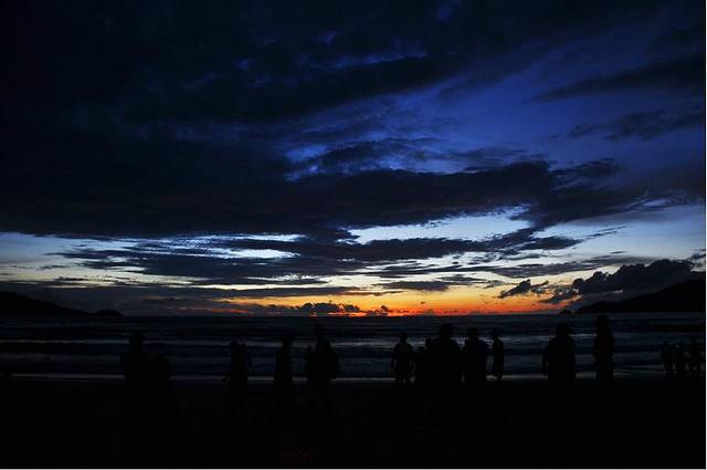 穿过江西冷。对面就是著名的酒吧街。穿过酒吧街。就是芭东海滩。远远地还没进江西冷就能看到漫天燃烧的金色云霞,加快脚步紧赶慢赶还是没有看到芭东的壮美日落。海滩上很多人。好几家小黑经营的滑翔伞很受欢迎。大概1300b可以在天上飞一圈看看日落云霞。漫天的金色一定很美。可惜我们赶到的时候太阳已经完全落下去了。只看到一点点金色的余晖。没有5分钟天就黑了。这时候小黑就把收了钱还没有飞的钱退给客人。说天黑了。看不到了。就收工了。这个举动让我们很是敬佩。在天朝。可能就算漆黑不见五指,收了钱的也会让你上去飞一圈的吧。