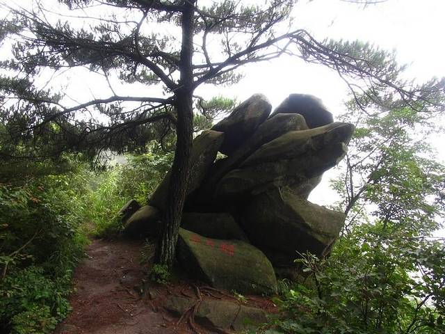 不知不觉我们已经到了下图中的这块石头了,大家说,它像什么?这不就是一只大青蛙,头北尾南,正张开大口,仰天长笑吗?大家再看看它前边的那颗松树,是不是像一只飞翔的凤凰。据当地人说,这青蛙就是贪恋这只彩凤的形优貌美,故嬉戏追赶到此而变成石头的,所以这个景点叫做“金蟾戏凤”。曾有人作了一首诗:“偷得人间蓬莱景,暗表初衰话绵情”。不过也有人打趣地说:这就是赖哈蟥想吃天鹅肉嘛。