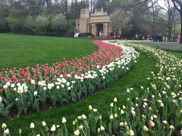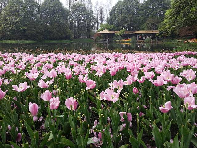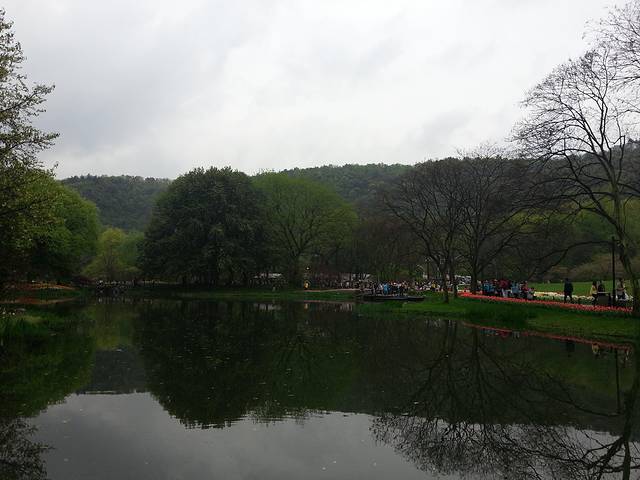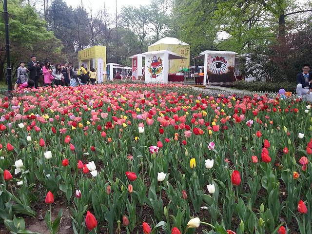 西湖真心好难打车, 幸亏我们还是坐了一辆电动的的士,在广州很少见到的。 因为交通管制的缘故, 的士师傅就把我们送到路口,他叫我们沿着看到雷峰塔的方向走,大概10分钟就到雷峰塔。 不然我们就看不到美丽的太子湾公园了。 刚好当天举行郁金香展,整个公园都是被花海环绕, 还有很多情侣在这里拍婚纱照呢。我们也拿起相机,帮我们两位美丽的西子拍拍。