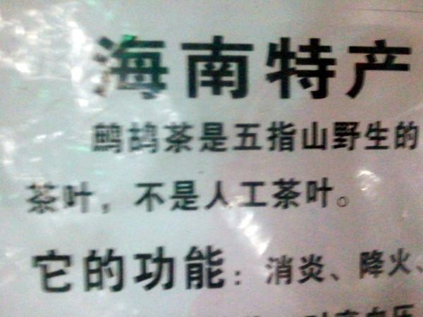 惊喜,在第一市场里居然发现海南的一种特产----鹧鸪茶,在云南方言里,说一个人是鹧鸪一般是形容这个人比较拧,不听劝,没想到来到这么远的地儿居然还有这种茶,真是辈感亲切,亲爱的立刻买了一串,注意是“串”哦,云南十八怪里有“鸡蛋串着卖”,没想到海南是“茶叶串着卖”,而且这种茶有清热解毒之功效,在三亚这种湿热气侯下饮用想必是极好的。