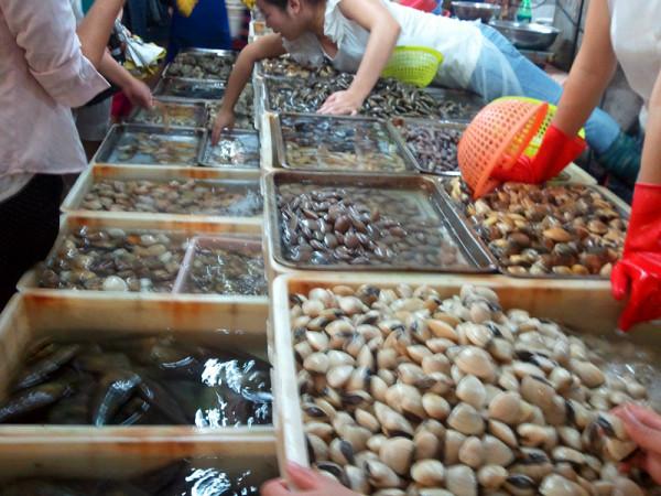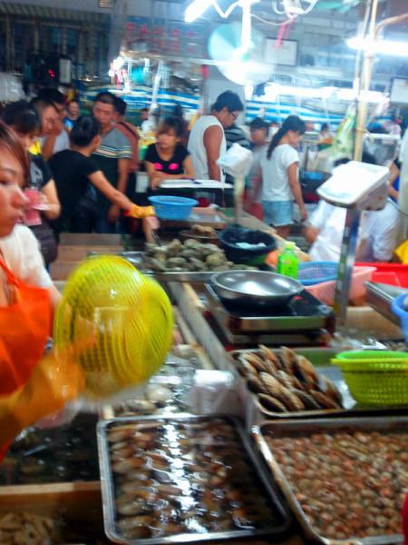 放好行李后,已是下午的六点左右了,来三亚就是为了看大海,吃海鲜,肚子已经有点咕咕叫了,于是立刻快马杀到早有耳闻的第一市场,从我们住处坐公交2个站就到了,这里早已开始人头攒动,听说这里小偷也多,于是我和亲爱的都十二分警惕的抱好了包包开始了第一市场之旅,虽然逛过不少菜市场,但第一市场的规模和人气的确不是盖的,各种海鲜可是琳琅满目,还有热带水果,之前还算做过功课,参考了多方食客的建议,把最值得吃的海鲜给记了下来,由于我们目标明确,于是我们买海鲜的过程可谓速战速决,在货比三家之后,又经过一番讨价还价,终于搞定了今晚海鲜大餐的食材了(注意,买海鲜时一定要把袋子里的水控出来,不然小贩会连水一起称,到时水也变成海鲜价了,最好在上秤前提前把袋子戳个小洞,把水控出来再称),而后又买了些热带水果准备回到住处慢慢享用的,抱歉,这里一手把着包怕小偷,一手已经拎满了海鲜,实在腾不出手照相了,所以片片有点少哈。