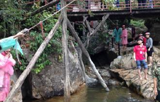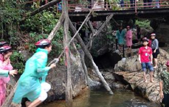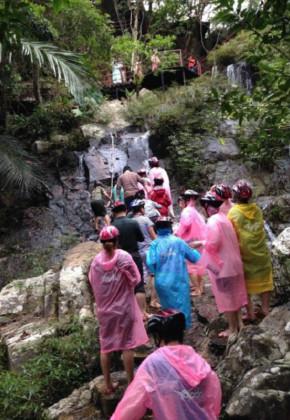 进景区通过短信换了票之后就去领踏瀑戏水的装备,有草鞋,还要戴头盔,这个时候工作人员会把你的东西包包什么的都打包,给运输到山上,到时候直接凭号卡,到了山上之后直接去拿就可以了。如果有防水袋的可以带一个,景区好像卖10块还是20块~可以买一件雨衣,或者带换洗衣服,因为全身很容易打湿的。去踏瀑戏水是先要坐游览车载着去山上,大概有15分钟的路程,路上会遇到下山的车,司机会让我们跟他们大喊呀诺达,我们那倒是每次都很积极,但是他们基本没甩我们,哈哈~