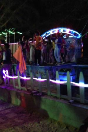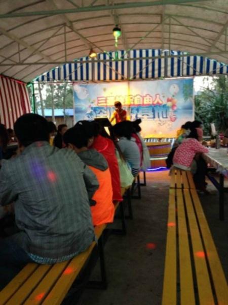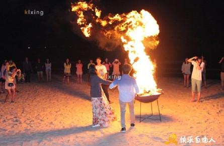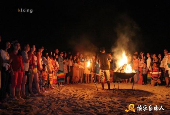具体我也不知道是哪里~因为我们是最后一车 当天有120人,所以先去赶海,捡贝壳什么的,然后等潜水都等到11点过才潜,可以拍照,价格也非常的亲民,150块钱8张,对比蜈支洲岛上的潜水拍照应该很便宜了吧~我遇到的是14号教练,教练是非常的好,不会强制推荐你拍照,还耐心的教你怎么适应下面的呼吸问题,我开始还有点担心,后来完全不怕了,一下去就看到好多热带小鱼还有珊瑚。然后瞬间就后悔没有拍照啦!可能是浮潜吧,也没有到很深的地方,不过对于我这种第一次参加潜水的人来说已经很满足啦!领队会给年龄差不多的朋友分好桌,保证大家会有共同话题,大家都是五湖四海来的朋友,互相不认识,同坐一桌,聊的也是十分开心~聊天的过程中,有一对姐妹是从长白山来的,他们给我们说他们去了东岛还是哪个岛。。也是就是有人搭讪来做渔船过去了,一个人150 ,15 20分钟就回来了,根本不好玩。。。我们瞬间就庆幸了没去东岛。 下午的冲浪很有意思,大家一人一块冲浪板,浪很大,领队还会安排坐香蕉船,每人都有一次,据说香蕉船风大开得快能比得上摩托艇~超级刺激~领队还非常贴心的为大家准备了姜汤,怕我们感冒,自己可以上来接姜汤喝,随时都是烫烫的,非常暖心,沙滩上还有沙滩排球,秋千,吊床等,不想下海的就可以坐在岸边休息,总之非常人性化。。等大家都换好衣服,领队会组织大家玩游戏。用餐同时,五湖四海的朋友们都可以上去唱歌,每个队会出一名队长上去唱歌,第一个还有奖励钱包~下面气氛也是非常欢乐的~吃完大餐后,就到了晚会的时间啦。大家可以上去和领队一起跳江南STYLE ,下面的朋友也不能闲着,都要随着音乐动起来~大家真的是放开了~这里借用一下快乐自由人的图图哈!因为当时我玩得比较嗨就没照相啦~大概的场景就是这样的,认识的,不认识的,都紧牵手跳起来,领队还会扮成翠花出来跳钢管舞,给大家开心,最后他们会放一首舞曲,每2个人一起跳恰恰,无论会跳的不会跳的都能参与其中。很好玩很感动,来三亚这几天是第一次感受到温暖~
