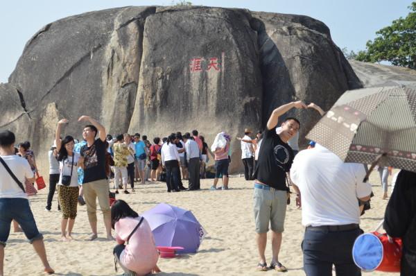 天涯海角算是海南标志性的景点了,南山寺到天涯海角的距离不远且公交车很多,大概20分钟的车程。值得注意的是,在车上,司机会忽悠大家去走一个小门,玩儿什么海上游天涯,还会说这里的票比走正门的票便宜很多,其实正门门票的金额完全不是他说的那个数字,个人觉得有误导嫌疑。天涯海角的沙质不错,整个景区也不算大,沿海一路走下去,一会儿踩踩沙子,一会儿在岸上溜达,不一会儿就能走到像南天一柱啊、海判南天啊(北纬18度)等种种石头。只要看到人最多的地方,那一定就是到了天涯和海角石了,本来想在天涯石那里跟石头兄合个影的,但眼见着排队照相的两队人马因为谁先谁后吵得不可开交,还是闪人吧。。。回程依旧25路,还是没座位。。