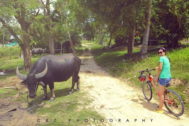 racha酒店是有免费借自行车的,在潜水中心那。不过数量不多借完为止,要求是两个小时内送回,不过我们超时了也无人问津。除了自行车,酒店还提供越野小摩托,费用是1000B/辆/天。价格略贵,大家可自行选择。骑行环岛其实还是满累的,上坡下坡的,不贵自行车胜在便宜。我也就忍了。作为一个有探险意识的人,我们特意顺着小路骑行,结果太累了,没有景色不说,路况也十分不好,经验之谈,荒郊野外没有什么好探索的了。骑行的路上除了有蜥蜴陪伴,偶尔还可看见一群鸭,或者一群牛之类的。水牛气势很足,不敢靠太近,远远来一张吧。