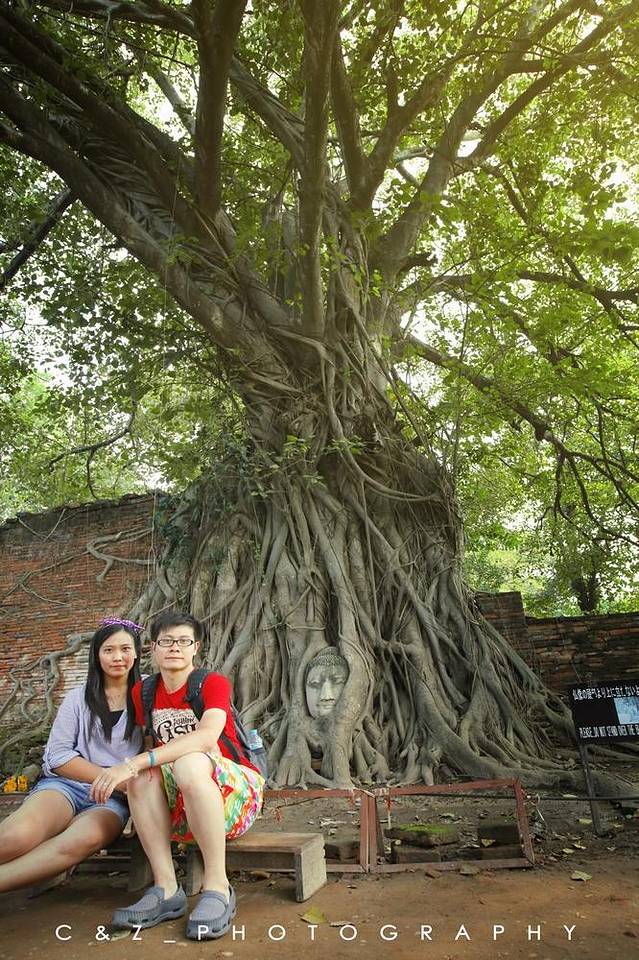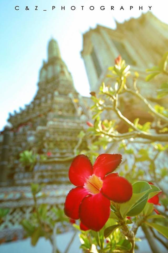 玛哈泰寺(wat phra mahathat)大城最具代表性的寺庙之一,面积很大。这个被树包住的佛头是当年偷盗者不甚遗落的,如今已经被榕树紧紧包裹,这也是这个寺庙的特色之一。红的是塔,黑的是佛。繁盛的寺庙,如今只剩残垣断壁。寺庙里静静开放的小花,大概也在守护这最后的断壁。