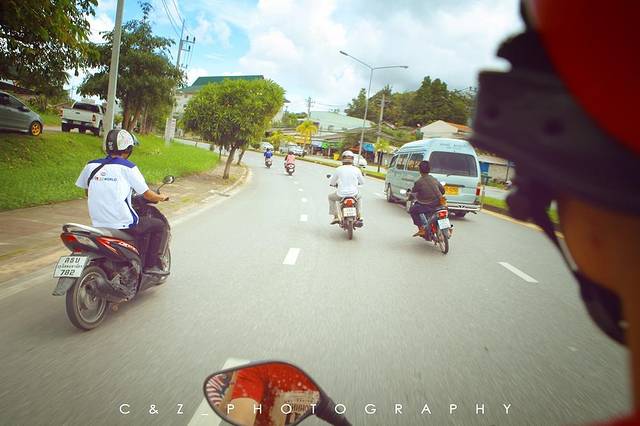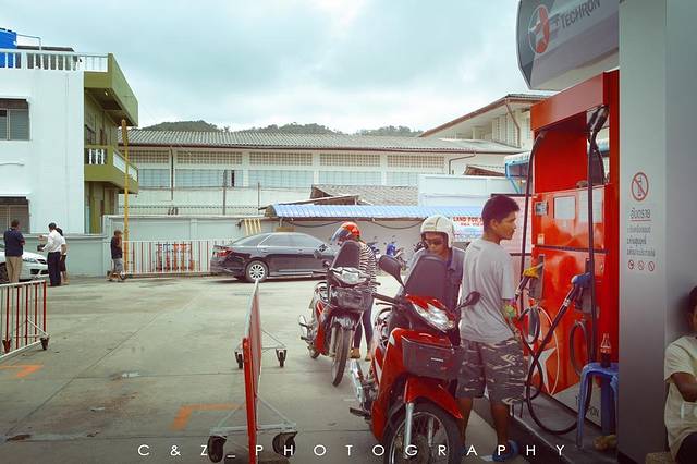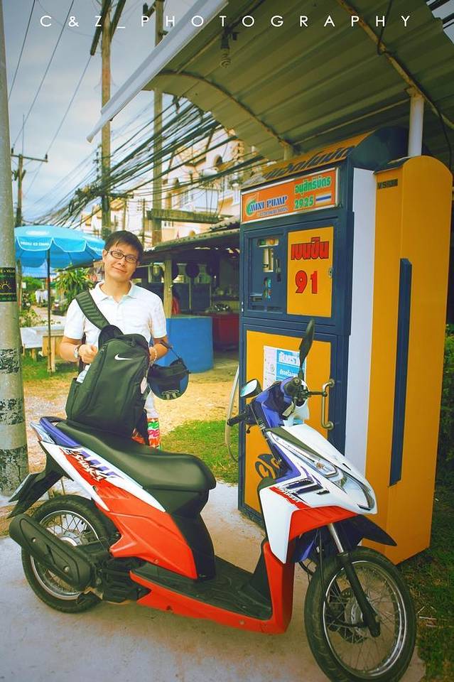 关于摩托车的故事真是曲折蜿蜒。这辆小摩托,带给了我无尽的痛苦和感动。到达普吉岛的下午,我们打算骑着小摩托,去普吉岛最南边的神仙半岛看落日。由于酒店定的比较偏远,周边没有什么借摩托的点,所以我们直接找了一家小店借了里面唯一的一辆摩托(250B/天)。骑着摩托就这么上路了,我们自己觉得已经开的很快了,但是当地人的摩托还是以绝对优势超越了我们,目测速度通常都在80迈以上。出发之前,我们特地到加油站加了100B的油,把邮箱加满了,但是开到一半的时候油表显示没油了。只能找了一个自助加油站去加油。(苦逼的男猪脚)