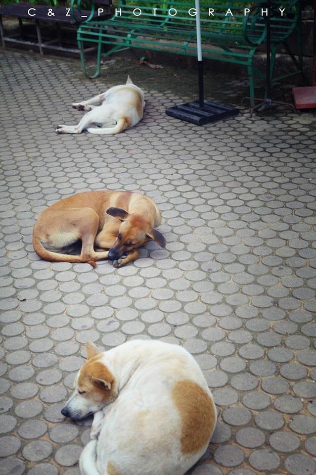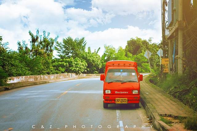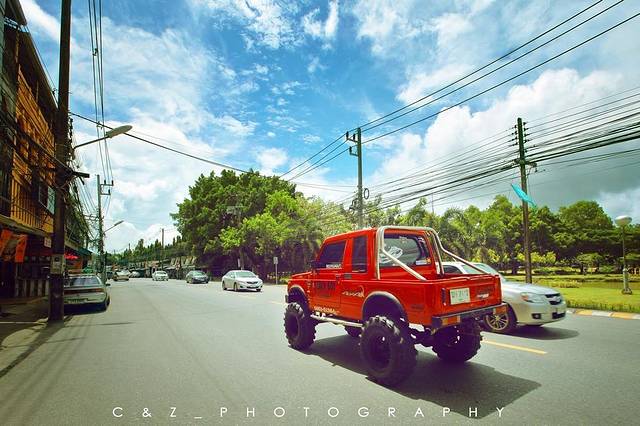 山顶上有很多流浪动物,他们似乎并不着急吃饭这种事,一个个睡的非常香甜。站在山顶往下看,喜欢这样的风景。天空、白云、小镇还有远处似有似无看不见的大海。从Khao Rang Hill下来已近中午十分,天空经过刚刚雨水的洗礼变得那么梦幻与不真实。街上有拉风的越野车驶过,大红色的车搭配蓝天绿湖,油画一般的风景。