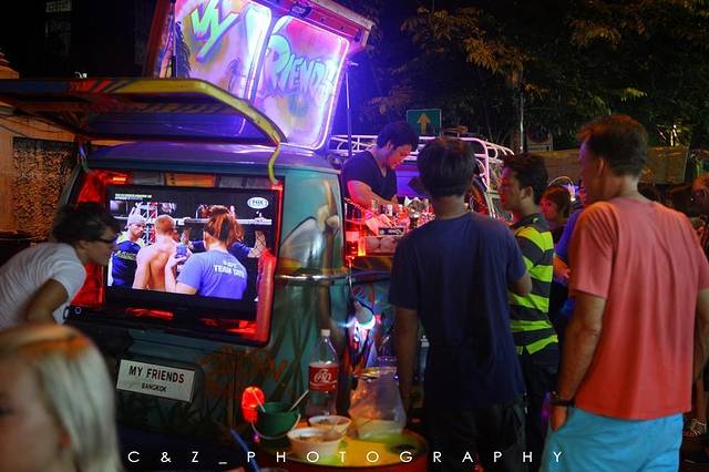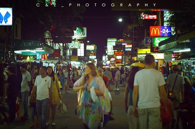 回酒店换了一身衣服(天气太热,汗湿了),休憩整顿,晚上直奔考山路。曼谷的考山路就是背包客的聚集地,就算到了凌晨,整条路上也是人来人往十分热闹。考山路上有各种曼谷小吃,还有遍地便宜的SPA享受。所以这边是去曼谷的人必须看看的好地方。凌晨1点的考山路,这种面味道不错,不过做好之后,记得调料多放点,味好美哦。每间酒吧都有驻唱,这个MM是不是有点像阿SA呢?