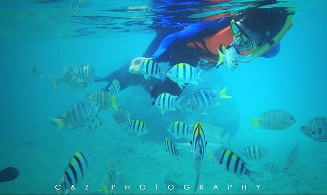 3)退潮时最好不要浮潜,浪很大,海面不平静。海浪一个劲的把你往礁石上推,很容易出事故。