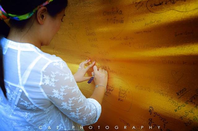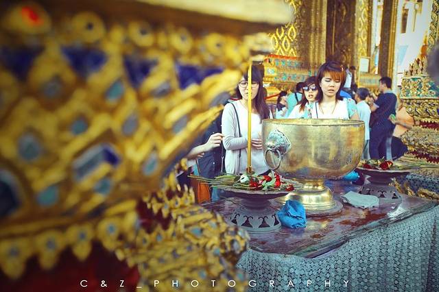 用金碧辉煌来形容玉佛寺真的是一点都不夸张,整个寺庙可以用陈奕迅的一首歌来表达《浮夸》。到处都是亮瞎眼的金色,到处都是闪瞎眼的小玻璃。折射的整个玉佛寺富丽堂皇。游览玉佛寺最好的方法是找一个中国导游,然后,听他给你诉说玉佛寺的来龙去脉,否则逛这个寺庙有点无聊。拜完玉佛,记得到门外拿支玫瑰点些圣水在额头,把好运带走。