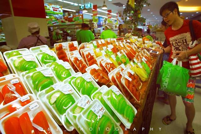 江西冷下面的停车场,这么多摩托出现在同一个空间里,真是有种密集恐惧症的味道。BIG C超市里面的水果展示台。木瓜、芒果、西柚、柚子一应俱全,实在是太美味了。芒果搭配糯米饭,请一定要尝试,口感实在没话说!