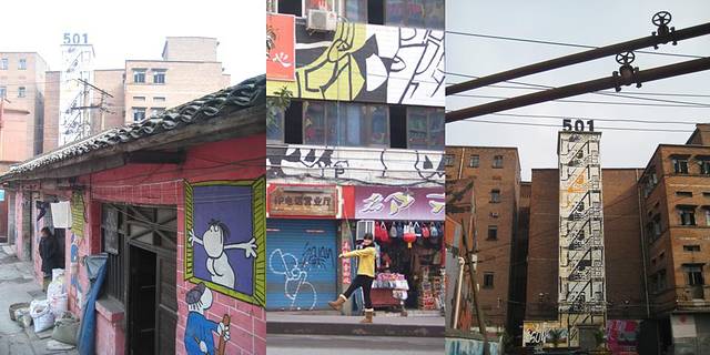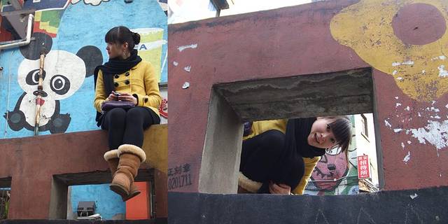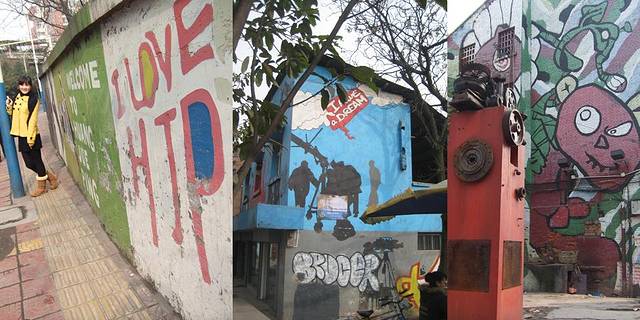 下午的计划是去九龙坡区的黄木角坪街道,那里有重庆著名的涂鸦一条街,简直可以用壮观来形容,整整一条街道的,两边的店铺,住宅,甚至是银行都被完完全全涂鸦了,置身于花花世界,一路从坡上往下走,不停地搞怪拍照,像两个孩子似的玩得不亦乐乎.