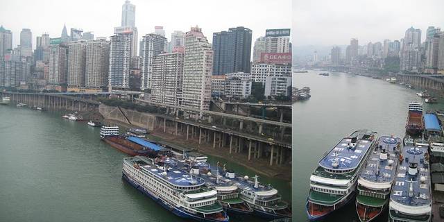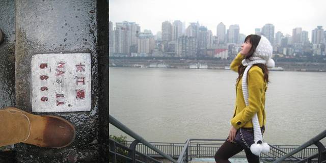 酸辣粉,酸辣米线,麻辣小面,麻辣串,一路下来,满街都是麻辣飘香,偶然阵阵的花香,我兴高采烈的穿街走巷,在一处狭窄的道口出来的时候,居然偶然遇见了'长江',仿佛这是第一次我如此的亲近长江.对岸,游船,码头,气鸣,每一处景物对于我都是新鲜,更是一种吸引,曾经浅浅印在脑海中的画面被一一刻画清晰,就这样一路歌唱着,一路沿着江行走,拍照,嬉戏,不觉时候,也不觉疲累,一直走到了朝天门广场,长江与嘉陵江两江汇合的地方.长江的浑黄与嘉陵江的清澈相交融和,不能讲清楚是哪一条江注入哪一条江里,齿形相错的美丽,在黄昏的一刻呈现着完美.