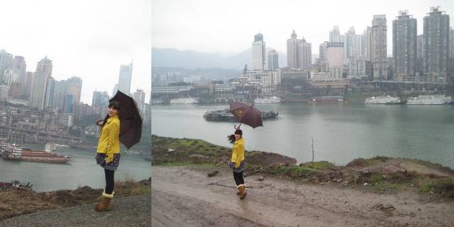 索道附近正在施工,重庆大剧院,所以道路非常泥泞,尤其是往江边的路,简直就没有了,都是深深浅浅的泥坑积水,还好此时的雨小了,毛毛细雨打在身上也不觉湿,拄着雨伞,深一脚浅一脚的往江边走,啊,一不小心弄断了酒店的雨伞,又败家了.