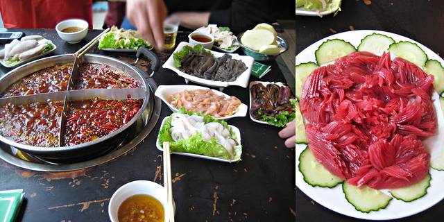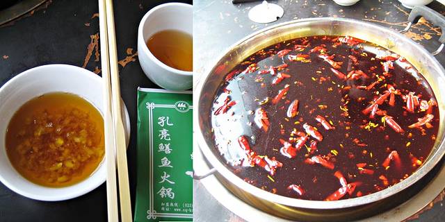 锅一上来,哇,火红的浓汤锅底,飘着火红的辣椒,扑鼻的辣味儿,我也入乡随俗的吃起了香油碟儿,估计要麻酱也没有,呵呵.香油里加一些蒜泥,味精,调味盐,恩~味道也还不错.点了很多菜,鳝鱼,耗儿鱼,鱿鱼,鸭肠儿,鲜黄喉,月君子(鸭胗),方竹笋,豆芽,百叶,等等,绝对正宗的重庆火锅,可我还是落俗套的点了一份土豆,我的最爱吗~