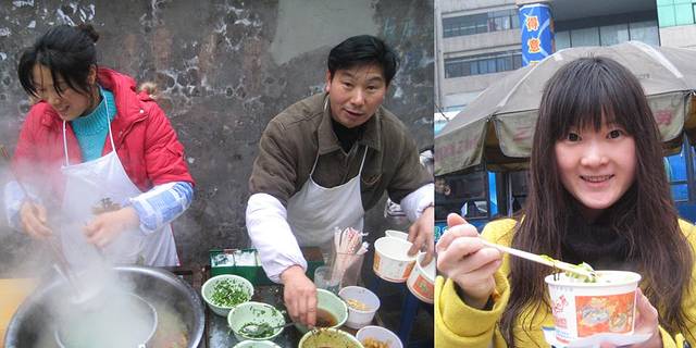 从酒店出来穿好食街,去往较场口,一路上与行人面向而行,每个人都行色匆匆的还是去往上班的路上,几乎每人都端着一份麻辣小面,或者酸辣粉,不论男女老少,不论白领或农人,边走边吃,如此的早点方式应该也算是重庆的一个特色吧,呵呵,入乡随俗,在路边摊也买了一碗酸辣米粉,热情的摊主还给我的米粉撒上了些番茄酱,并且告诉我要搅匀了才更好吃,味道真的很不错,我也端着小碗边走边吃.