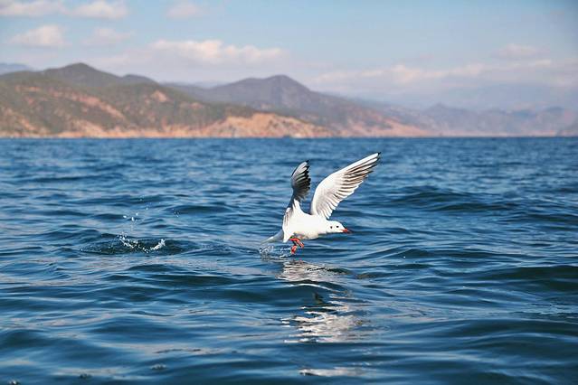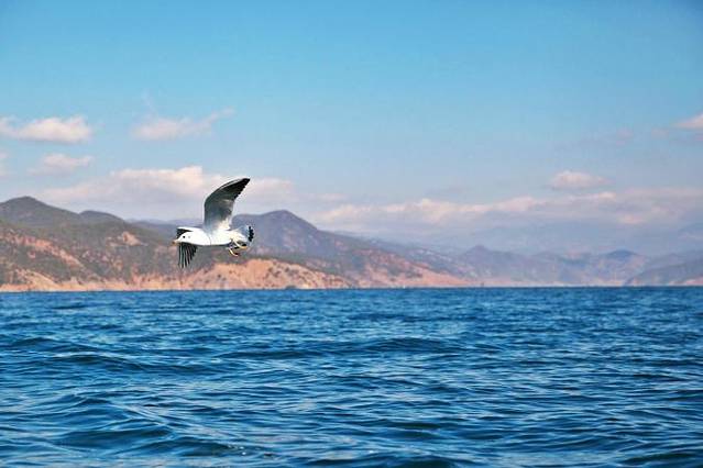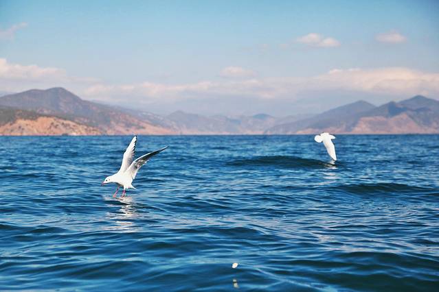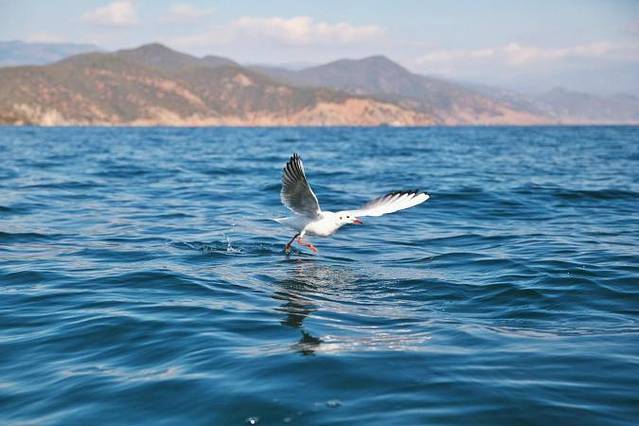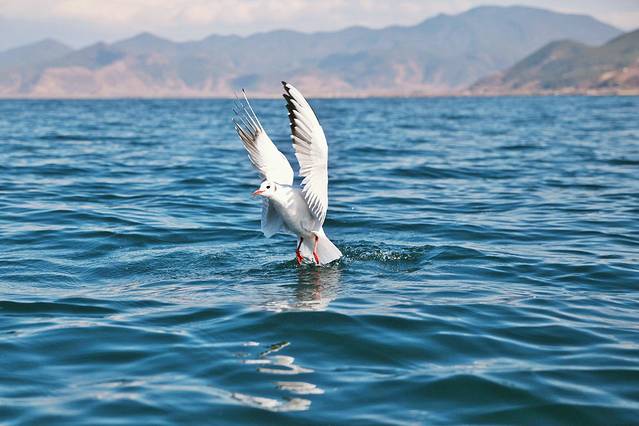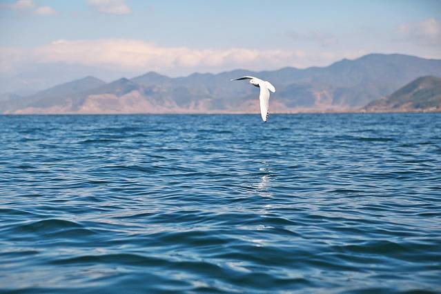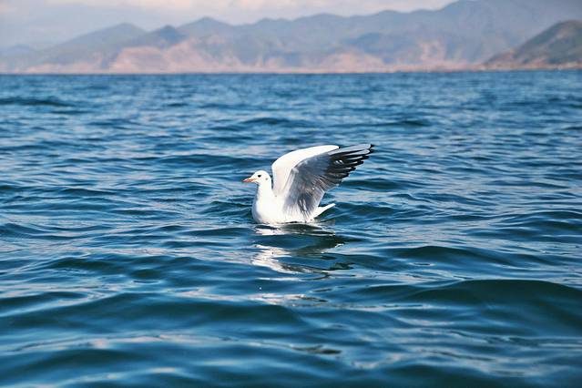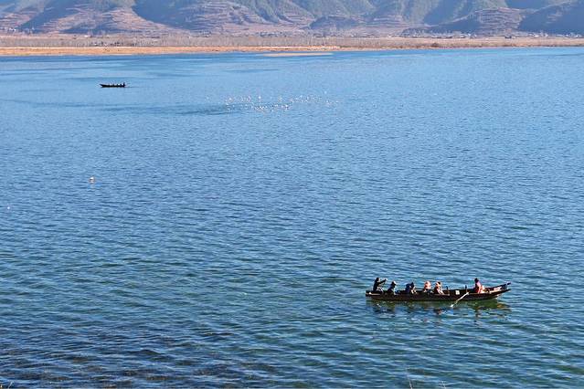 随后车停在了应该是三家村附近的码头,为了不百无聊赖地一个人呆在岸边傻玩,并且冲着在湖上方成群盘旋的可爱海鸥,我还是选择付了50元参加坐船活动咯。终于排队上了船,一开始我欢乐地爬到船头独享开阔的视角,突然听闻船头要负责划桨赶紧又利索地逃了下来。