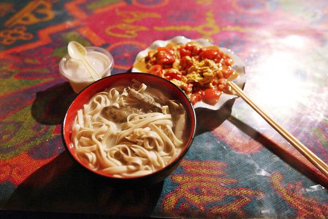 紫鸢尾的餐厅在村口的马路上,入住后洗了把澡我就独自穿过村子去觅食。正逢夕阳落山后的最后一抹晚霞。摩梭大妈听问我只有一个人,一定是同情我可怜给我下的鸡汤面底下藏了块好大的几块,番茄炒蛋里黄色也比红色多,所以你看一个人也未必都是不好。作为一个非常不喜欢一个人吃饭的人,所以老天安排了只猫来陪我嘛。。导致我整顿饭都在和一只从各个角度stand by 随时准备跳上桌子抢我碗中餐的大花猫作斗争。吃了一半的时候,同车的那两位姑娘也来吃饭了,于是有一搭没一搭地聊起来。也幸好遇见她们,可以结伴一起穿过已经完全陷入黑幕的村庄回客栈。