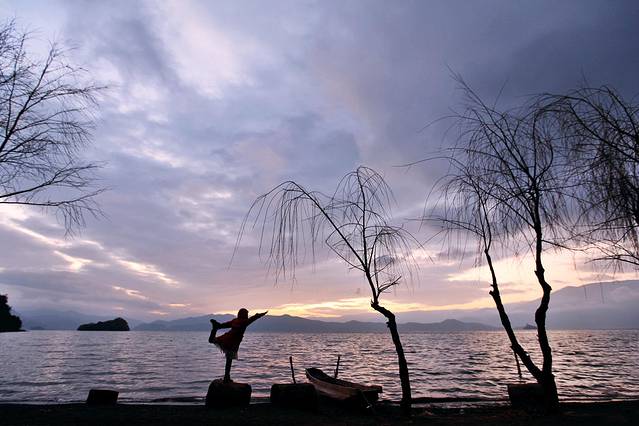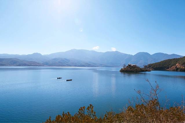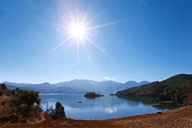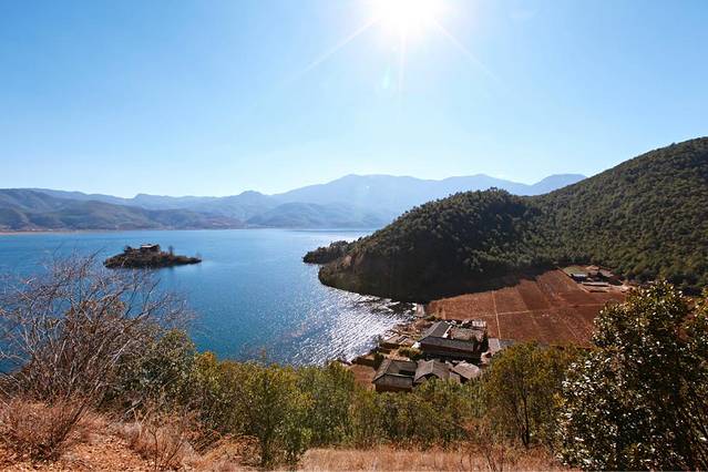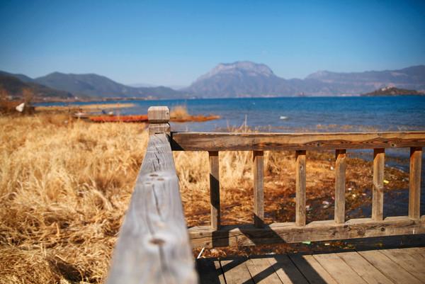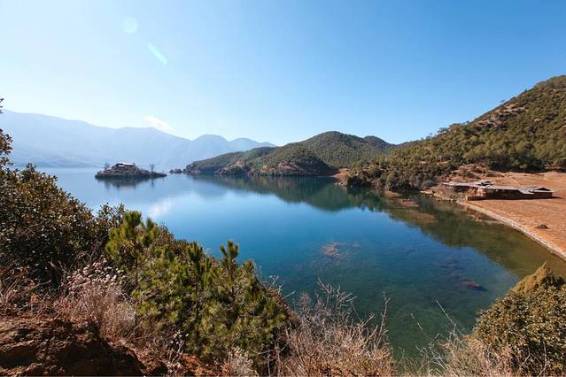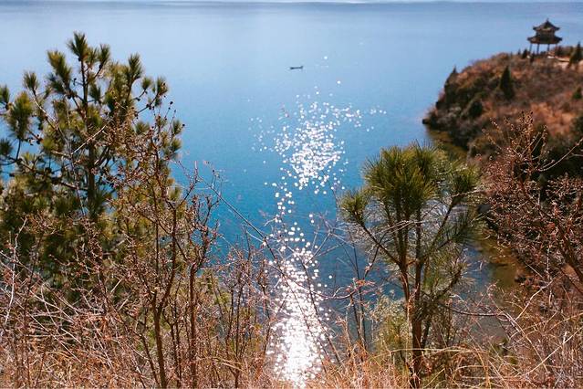 回头看到的洛佳码头,视野不断地开阔起来。大中午的太阳就算是冬天也非常刺目,在水面上照出星星点点的反光。哇这么美难道这就是女神湾了吗!算了吧,才走了十分钟怎么可能。经过一个小半岛,上面的凉亭里有一对摩梭族人在劈情操的说。虽然有打扰之不好意思,可还是厚着脸皮走近过去,凉亭很好看呐。然后我就用更厚的脸皮,在凉亭里那对人错愕的眼神(咳咳 自己意淫的)里,蹦跶着来了一发自拍。