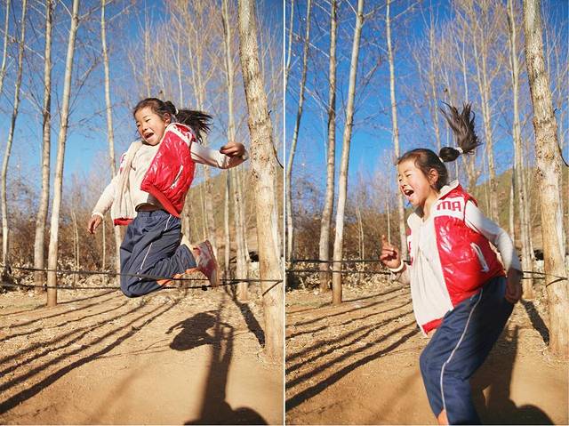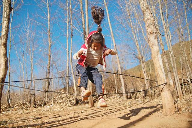 准备回去拿广角镜头的时候,在树林正好碰到尔车家的拉姆小朋友一个人在跳橡皮筋,清晨的阳光下,树林的斜影,活跃的辫子,那画面太美好了,让我不由自主地就走过去和她聊天起来。(果然我只适合搭讪小朋友么。。)我真是太喜欢她无忧的笑容和飞扬的头发了。拿了广角来拍的时候,小喇叭还在那儿飞奔。。。。尔车家的另外两个小男孩儿,在用船桨破冰,一边互相打闹着一边跨啦跨啦地敲打着冰面。