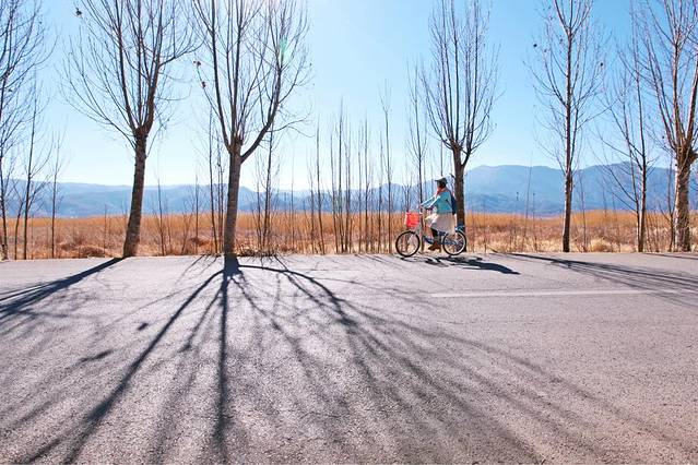 在码头来来回回拍了好久,几乎是依依不舍地骑车出发去走婚桥。一路上随时都能看到湿地,总是骑不了几步又忍不住停下来拍照。在森腾客栈前的这个骑车自拍那叫一个辛苦阿,先摆好相机,把自行车推到对面stand by,对焦按下延时快门再奔过去假装淡定地骑过去。。。。。
