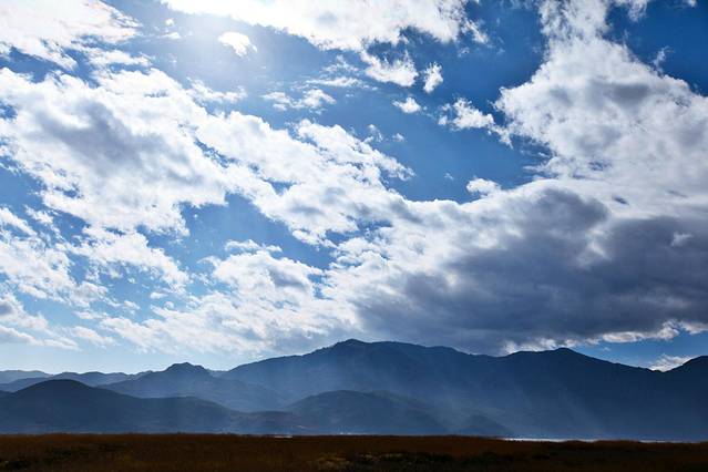 云朵在湖泊上方时而遮蔽住太阳的光芒,时而又洒满整片天地,每一种风景,都各有各的美丽。