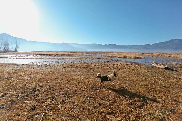天空微亮就起来了。只是害怕错过每一刻的景色。显然前一日并没有观测好方向,其实在草海尔车家这边的位置,是并不能看到日出的。或者更准确地说,太阳是从山后面一点点把光芒散布过来的才对。早上的草海边,除了我就只有尔车家的小狗小喇叭一直前前后后欢乐地跑着,不停地在我自拍的镜头里乱入哈哈。