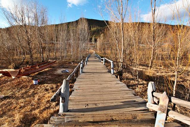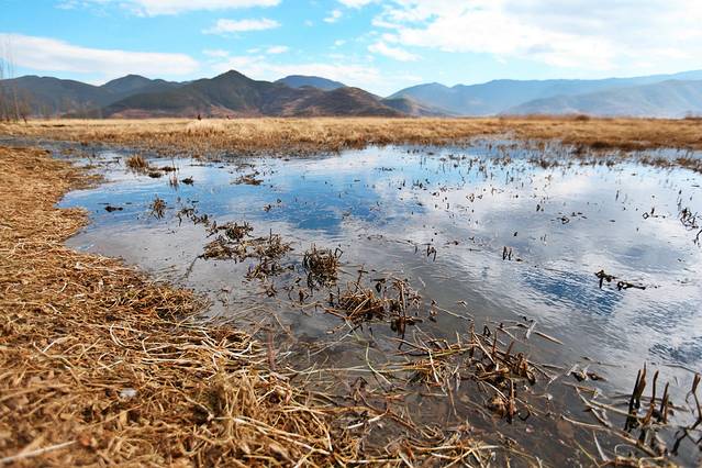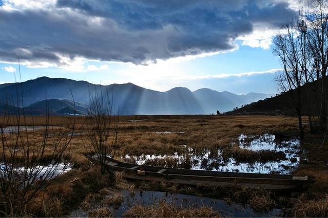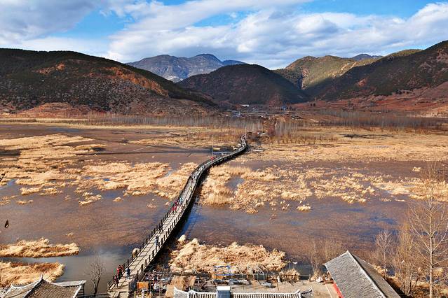 穿过走婚桥,可以在上山到观景台看全景。我觉得我真是运气好到飞起了,一上观景台,阴沉了许久的天空突然就把太阳放出了云层,露出了短短几分钟,容我按下几张照片后就又迫不及待地躲回云后去了。从走婚桥往回走的时候,太阳已经彻底普照大地,于是我又顺利地看到了阳光下的草海湿地。