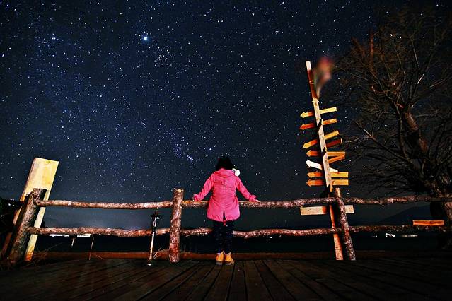 虽然没带三角架但还是一定要利用各种现成道具做固定,拍下如此感动的天空。银河慢慢升起来。稍微盯着看一会就会有流星哗地坠落到山坳里,来不及许愿。湖边只有我一个人,按下延时快门等待成像的30秒里,世界就好像也只剩下我一个人,坐拥整片星空,我真的恨不得整个人横躺在地上,被天地怀抱。湖水一浪一浪的声音不厌其烦地循环播放。晚上的风越发地大,头被吹得生疼,也只是为了让我有更为深刻的感官记忆吧。心满意足地赏完星空,去找客栈老板询问明天早晨日出的时间,被正围坐喝酒吃烧烤的人们拉着一起坐下聊了会儿,幸亏四川话还算比较好辨认,我夹在其中也能没有障碍地相谈甚欢,并认识了一对成都自驾来的情侣,而这将是下一段故事的铺陈巧合。