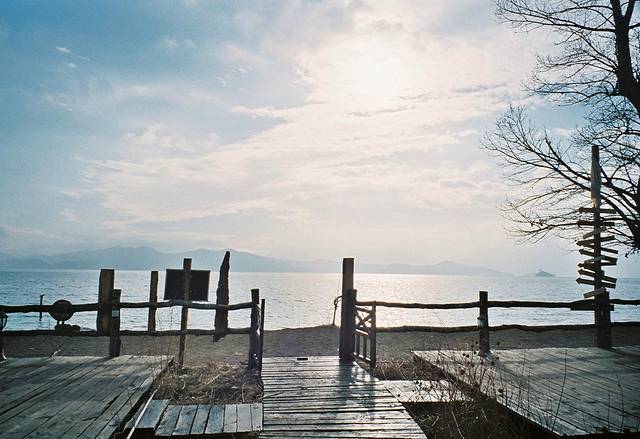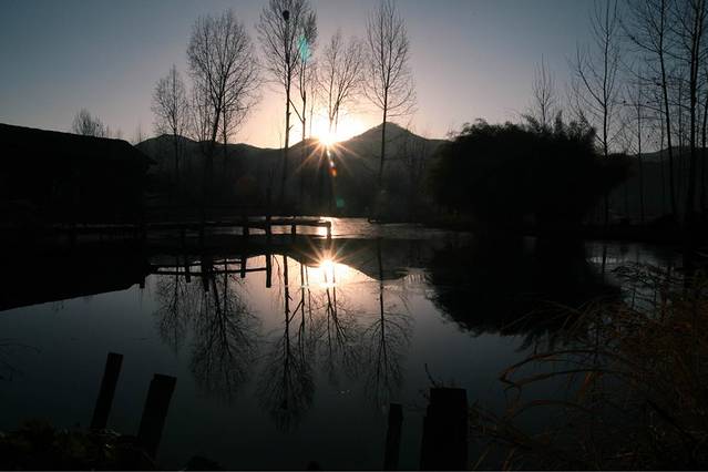 回程的路上遇到一个废弃的小学校,两个小朋友在已经几乎没有篮筐的篮球架前玩耍。看到我拿相机拍,他们更为卖力地扔起球来。在学校的一角,突然看到只被拴在垃圾堆里的小狗,也没见主人。我只是略微走近过去,它就急迫地站立起来,摆出这样的姿势,让人心声怜悯。可惜我翻遍了包,只找到唯一能吃的东西就是薄荷糖而已,看它见我翻包更为地迫不及待的样子,不忍让它失望。。我只好尝试着丢了几颗糖给它,希望没有凉到它= = 然后打算第二天带点肉干过来喂它,隔日再来的时候,狗狗正被好几个游客围着喂食,恩,我就安心啦。归还自行车之后,在博树村这里看到个不再使用的码头。顺着栈道走进去,太阳正要落山。准备落山的太阳还在不遗余力地发光。