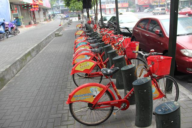 杭州的街边随处可见公共自行车租赁,城阳的这边就是借鉴杭州的~~~