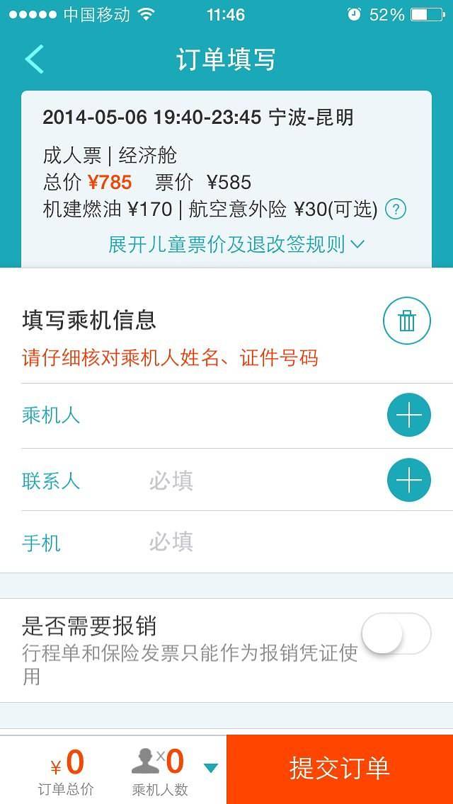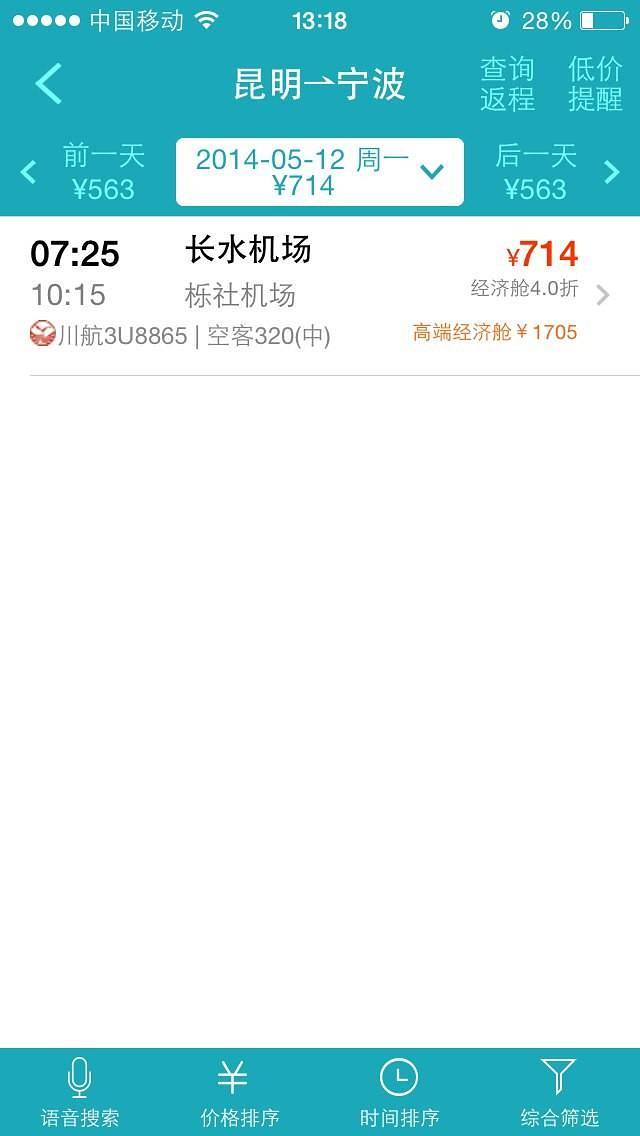 宁波往返昆明机票与之前所查的不一样,很稳健的算1600元