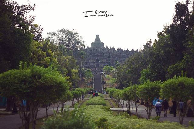 穿过草坪和树林,远远地就可以看到举世瞩目的古代亚洲四大奇迹之一——婆罗浮屠。