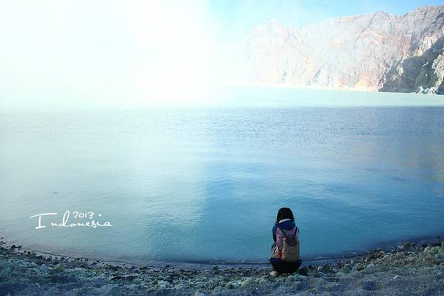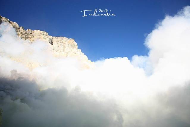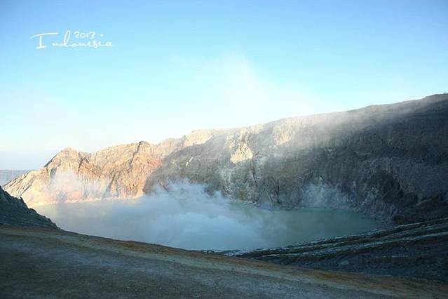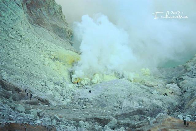 虽同为火山,但ijen和bromo风格迥异。在这里,需要先爬一个多小时的山,到达火山湖,然后再走半个多小时崎岖的石头路,下到湖边。这里可以看到人工采硫磺石的工人,他们会挑着我们使半天劲都纹丝不动的硫磺石上山下山,以换取微薄的收入。我空手爬山还累得喘得像三元,被硫磺熏得差点晕倒。。。。。