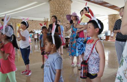 万豪的酒店的标志性一景,漂亮的很,特别是全景。这周是复活节主题,list上安排的满满当当,而今天正好是节日当天,扮成小兔子参加特别活动,小朋友认真的听着注意事项,活动就是-各国小朋友一起找彩蛋。不过天气实在太热了,玩了一半就回来了,收获还是不错,虽然都是些杂七杂八的小东西,但小朋友很喜欢,老爸舍命陪儿子,整个猪颈肉都红了,还坚持着,另外,儿童游泳池太小,还是晚上的成人泳池好玩。。。