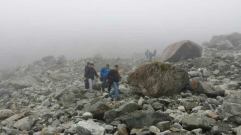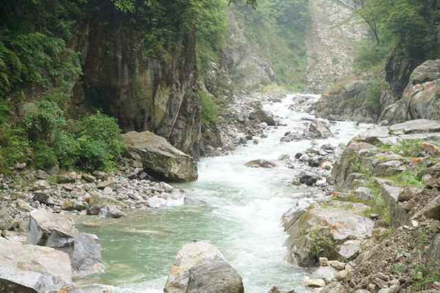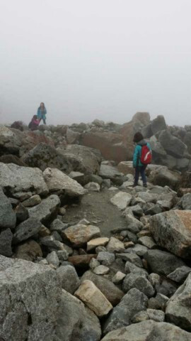 早餐是令人愉快的双椒拌面,但是到海螺沟比头文字D更厉害的弯道左右摇摆接近一个小时,海螺沟以冰川、冬日雪景出名,5月份是看不到雪景了,但是冰川还是值得期待的,坐了1个小时左右的盘山巴士,又坐缆车,下了缆车还要走1个小时的路。。。上山下山爬乱石堆。。。。没想到第二天就是一个大挑战。。前往冰川根本没有修好的大路,大家都是踩着乱石堆,慢慢找个落脚点,一步步走下去又走上来的,绝对是个体力活。在乱石堆中颤颤巍巍气喘吁吁,可惜人品不够,大雾茫茫一片犹如自身于天朝京城。没有看到心里想象的冰川,而且当时天气也不好,烟雾弥漫,飘着细如牛毛的雨,润湿了衣服鞋袜,走在乱石堆上更容易滑跤。